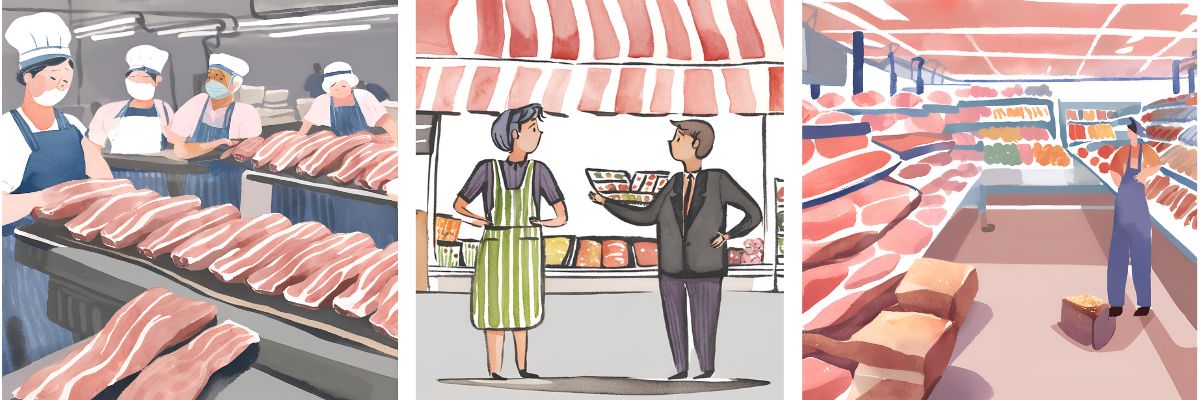 関西圏を中心に、食肉(豚肉、牛肉、鶏肉)並びに食肉加工品、各種食材の卸売を行っております。食品販売店様や飲食店様に、独自のネットワークで集荷したこだわりの食材を、顧客の希望に沿ったかたちでお届けしております。
